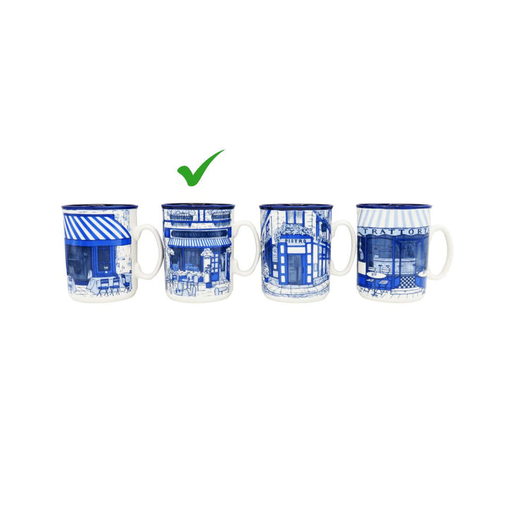 Blue café & streetscape illustrations – each mug has a unique artwork