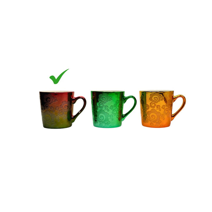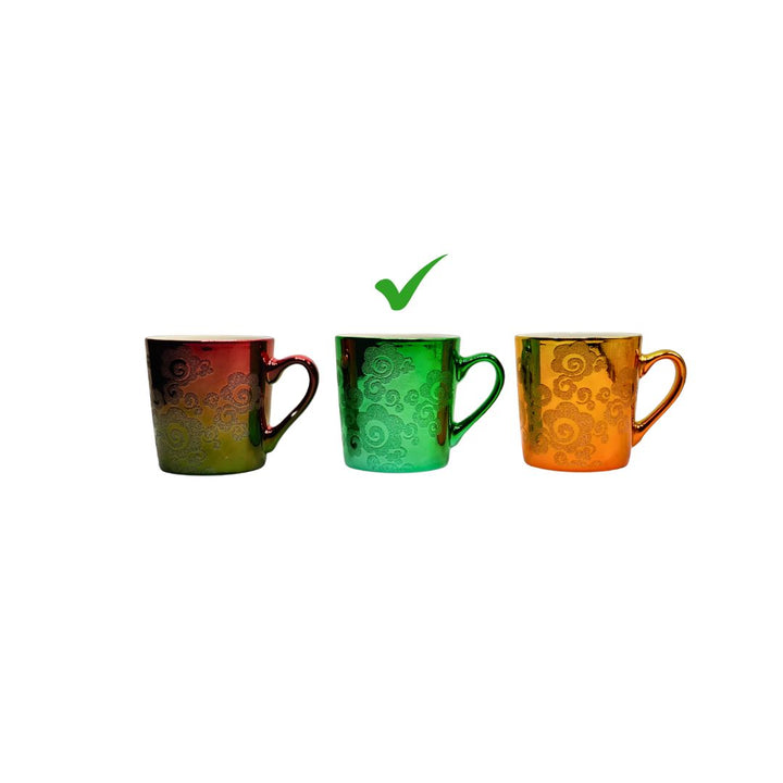 Designed to elevate your everyday tea or coffee moments, each mug features a vibrant gradient finish paired with intricate embossed swirl motifs, giving it a luxurious and artistic appeal.