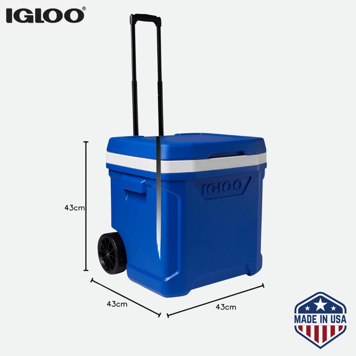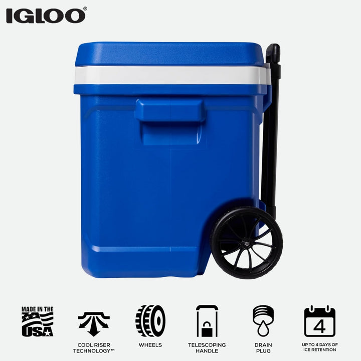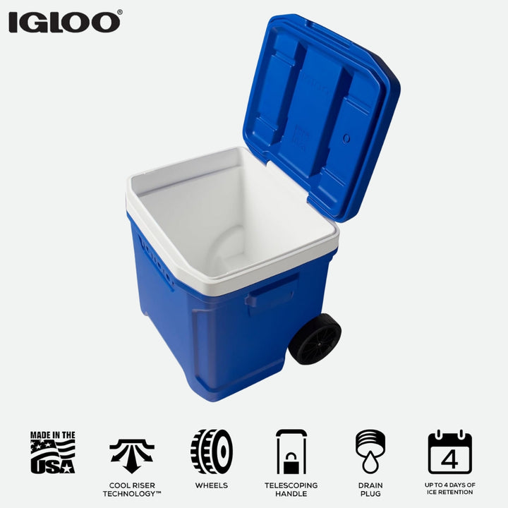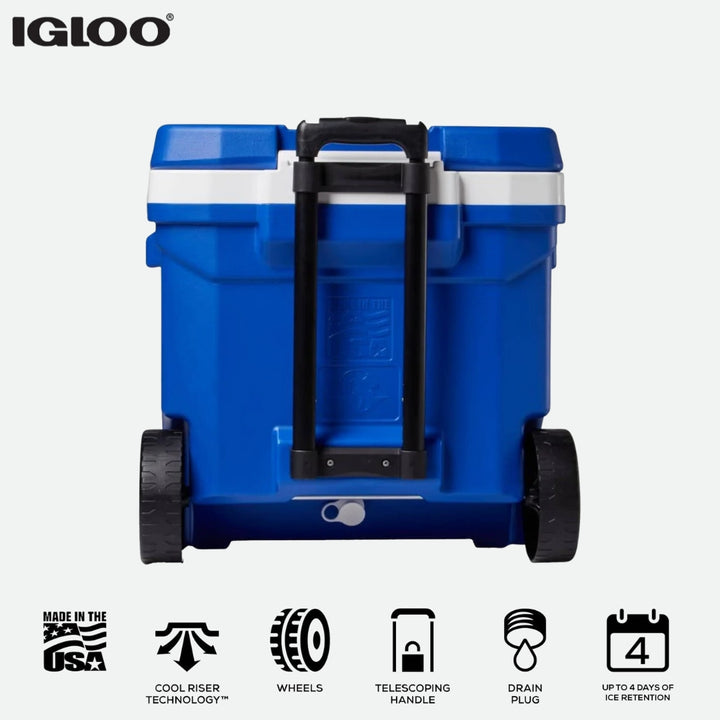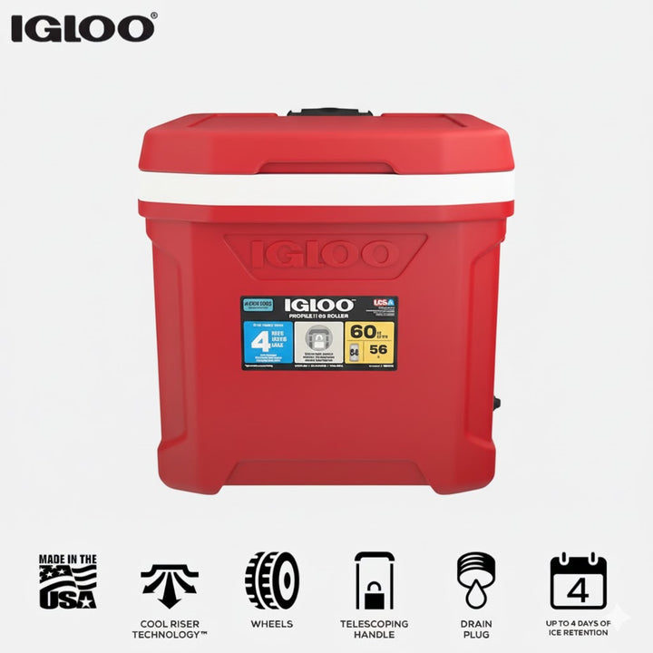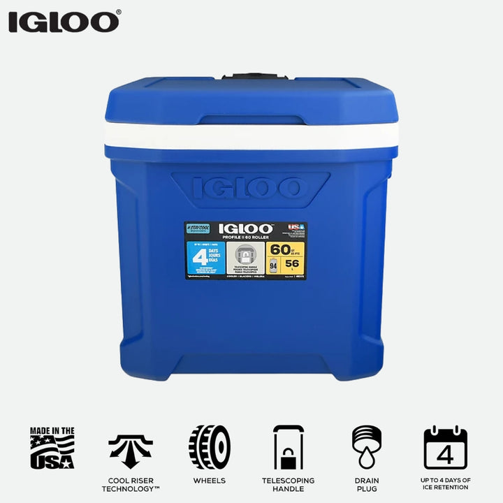 The Igloo Profile 60-Qt Rolling Cooler is built to make every outdoor adventure easier. Designed with durable wheels and a locking telescoping handle, this cooler glides smoothly over grass, sand, gravel, and campsites — perfect for picnics, family outings, BBQs, and road trips.this Igloo roller cooler makes sure your refreshments stay cold and ready.