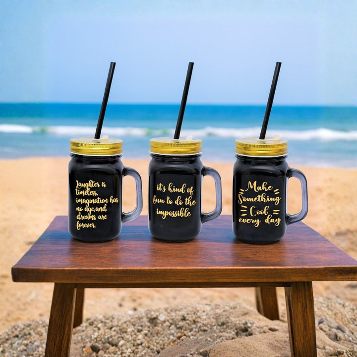 Bring style and motivation to your daily hydration with this premium set of Black Frosted Glass Mason Jar Sippers. Designed with a sleek matte finish, each jar features a unique gold-printed inspirational quote that adds charm and personality.
