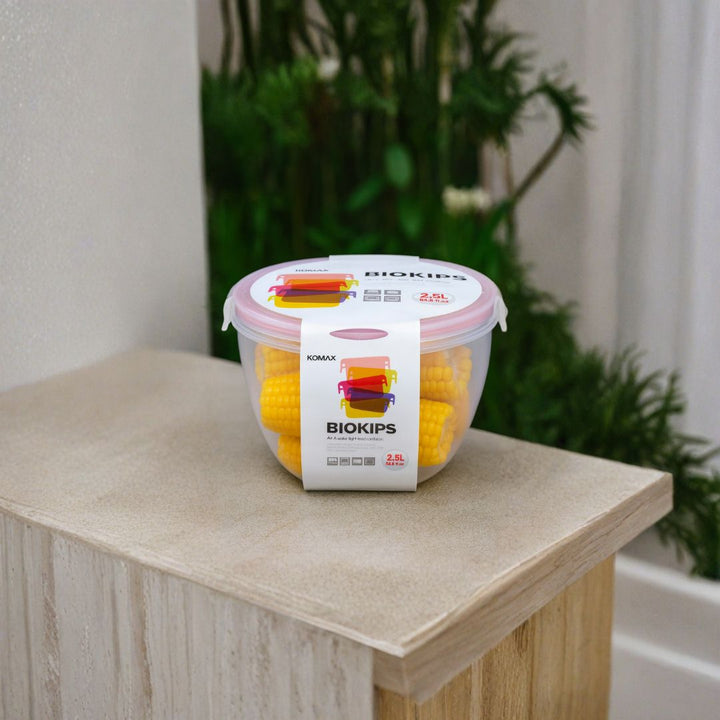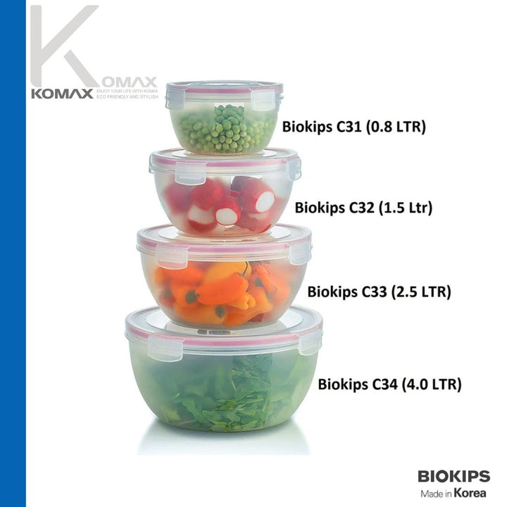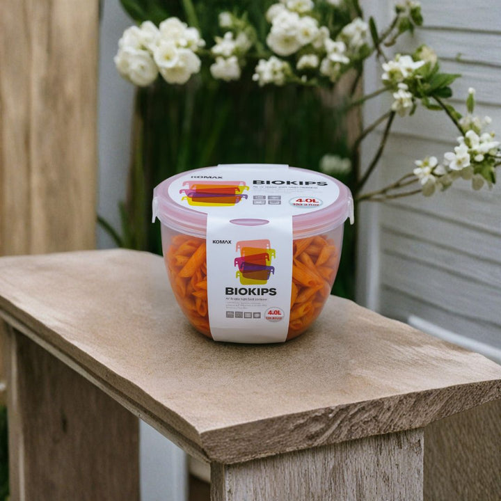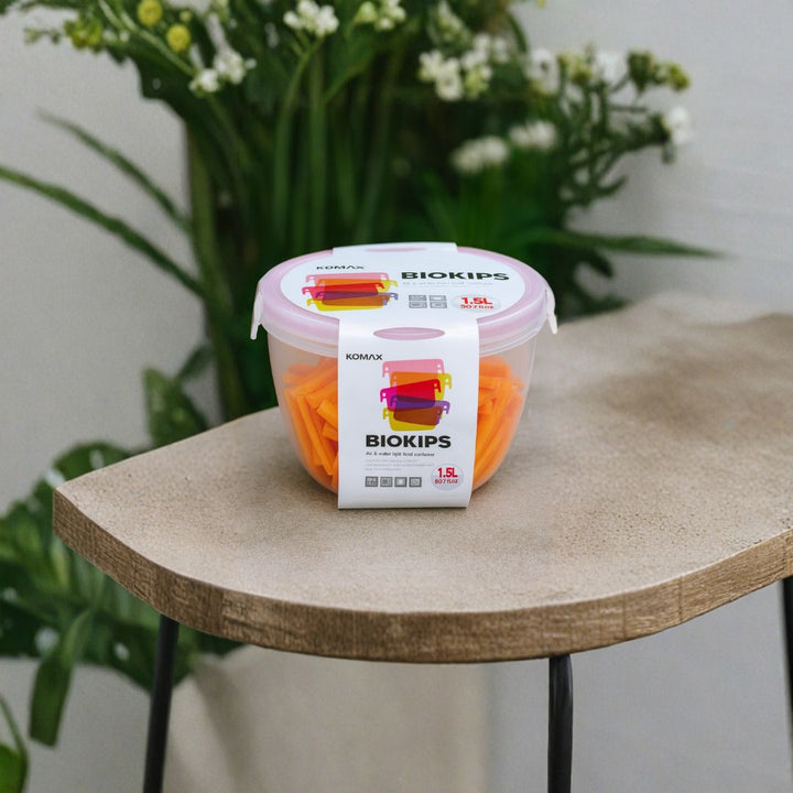 The KOMAX BIOKIPS is a compact and durable airtight food container.. Designed with a 4-side locking system and a strong silicone seal, it keeps your food fresh, leak-proof, and protected from moisture.while the airtight locking system prevents spills and maintains freshness. Dishwasher-safe, freezer-safe, and microwave-safe (lid removed), this container delivers long-lasting, hygienic storage.