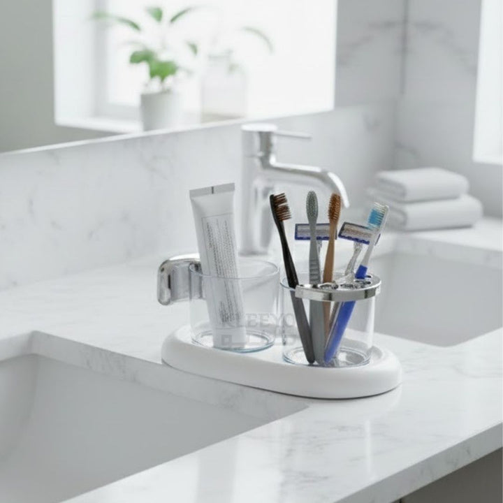 Toothbrush Cup is a sleek and practical countertop storage solution designed to keep your daily oral care items clean, accessible, and neatly organized. Featuring two clear removable cups with a hygienic base tray, it provides designated space for toothbrushes, razors, toothpaste, and dental accessories.
